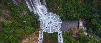 懸空玻璃平臺全長202米,以72米的懸空跨度名列世界第一,為美國科羅拉多大峽谷的U形橋(21米)的3.5倍;點(diǎn)睛之筆是平臺頂部直徑16.8米的玻璃觀景圓臺,這是和瀑布親密接觸的絕佳位置。圓臺中間獨(dú)具匠心地設(shè)計(jì)了網(wǎng)格狀鏤空,山風(fēng)穿透,頓生寒意;踏步其上,如墜深淵,令人心驚膽寒。